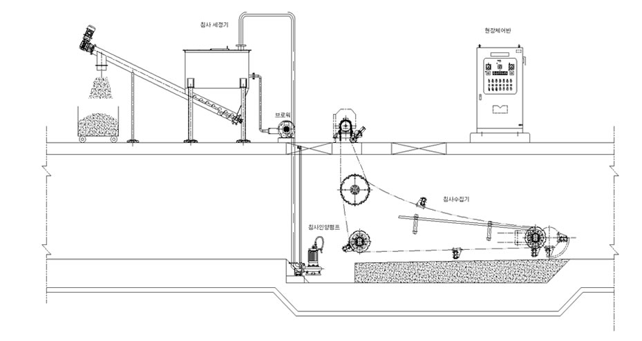 무한궤도 회전형인 체인플라이트식으로 침사 수집후 펌프를 이용하여 세정기로 이송